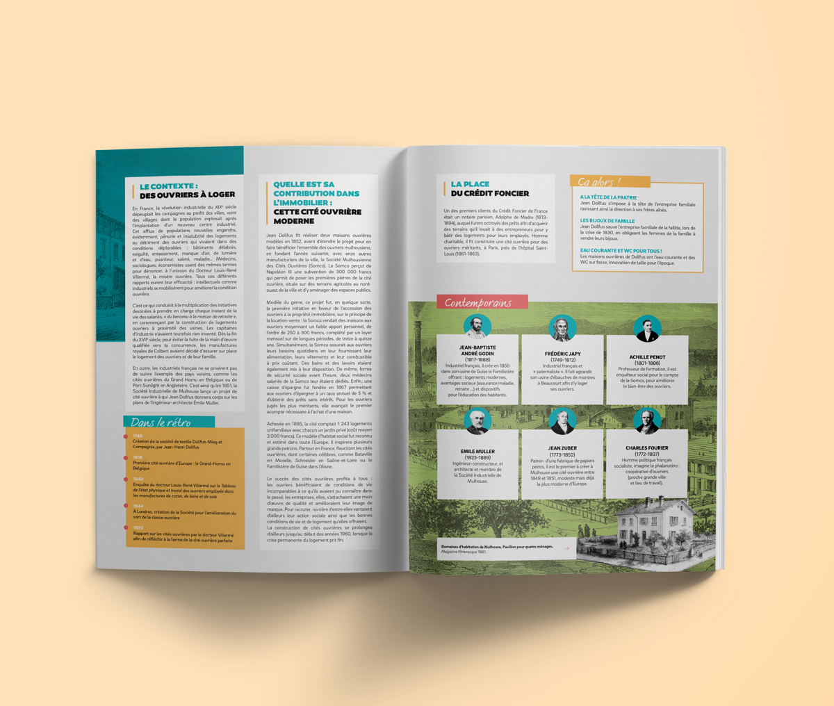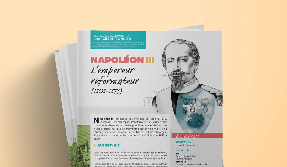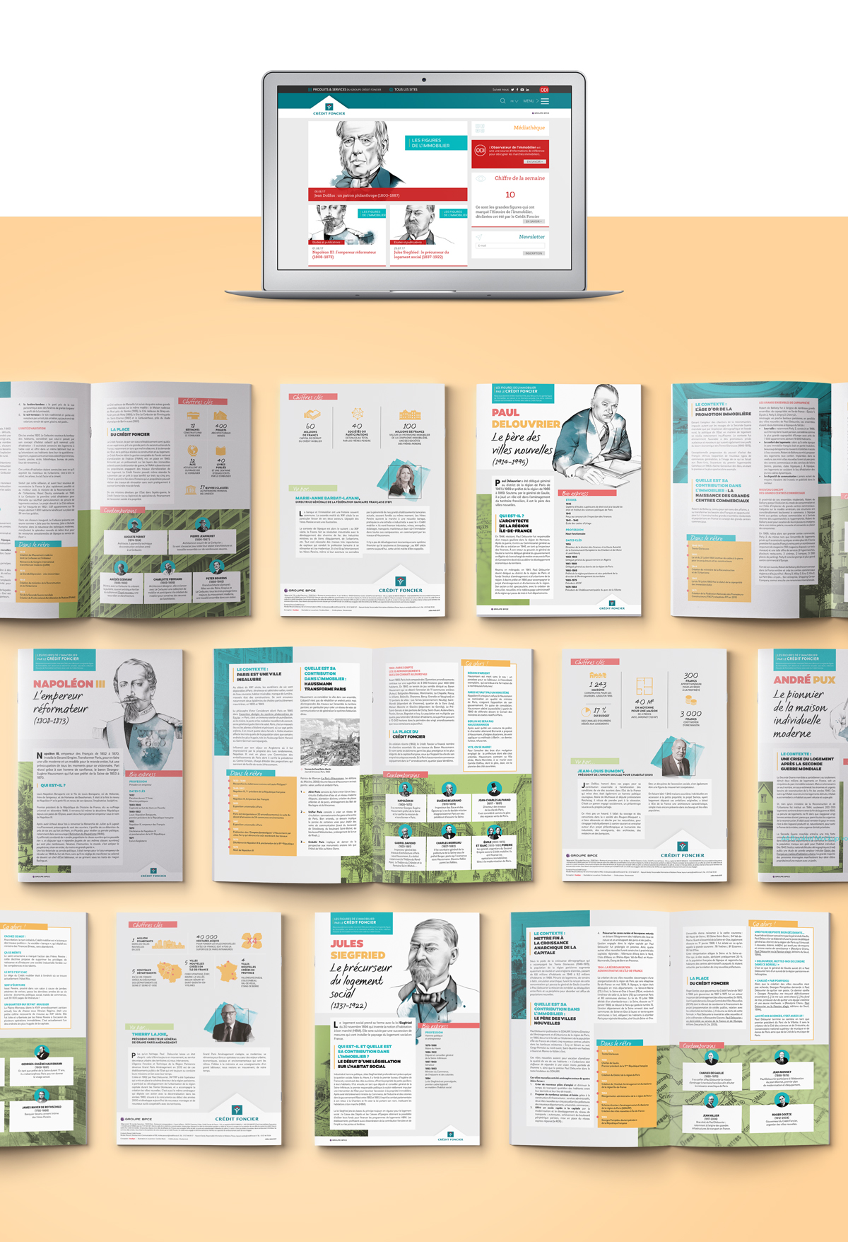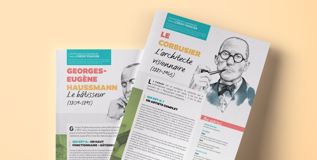 Nous avons conçu graphiquement une série de portraits présentant l’œuvre de grandes figures de l’immobilier et leur résonance actuelle, mêlées à l’histoire du Crédit Foncier.